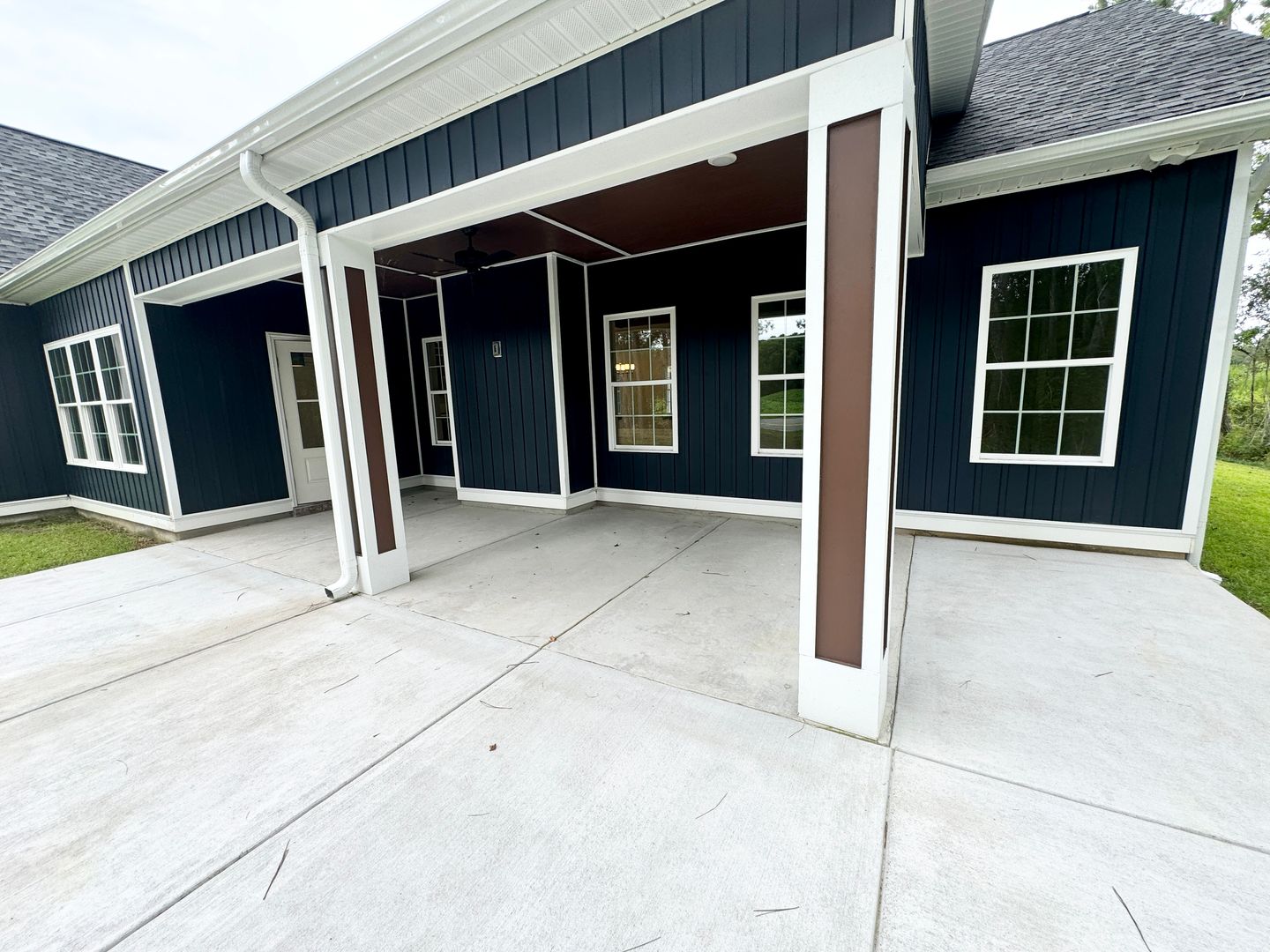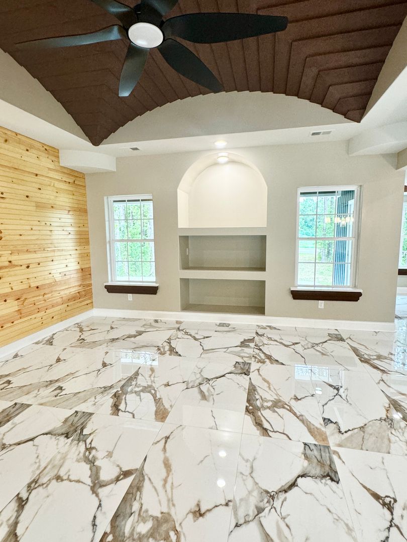 Raised back patio with ceiling fans, wall outlets for your outside TV and extra parking in the front circle driveway.
