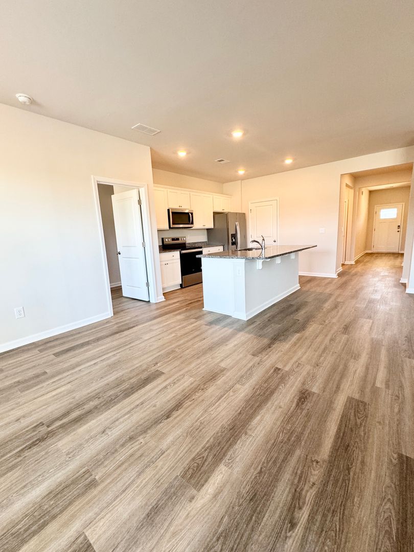 The kitchen boasts a large pantry, granite countertops, 36" cabinets, and beautiful stainless appliances.