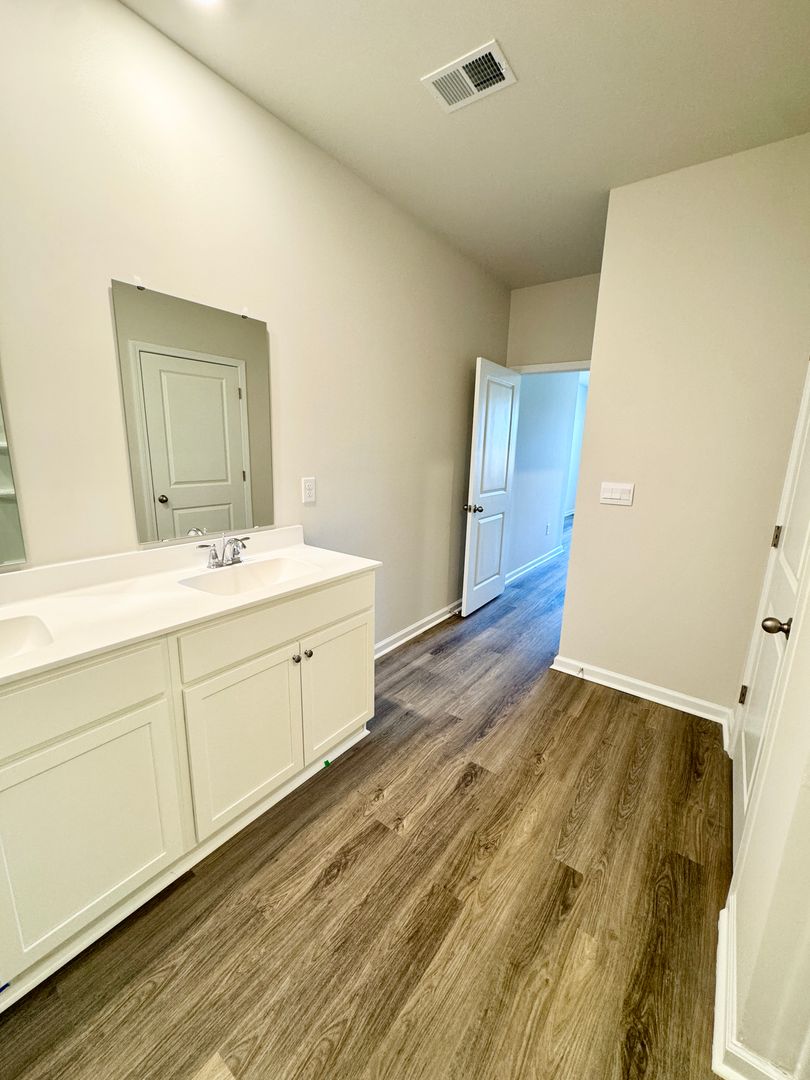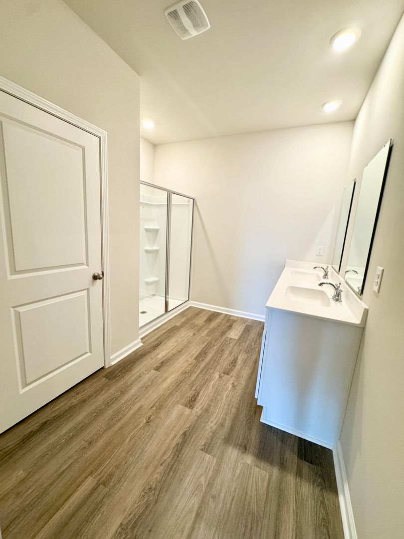 The master en-suite is tucked in the back of the house, separate from the guest rooms, with a large walk-in closet, double vanity and 5 ft walk in shower in the owner's bath. Master bedroom with pond view!